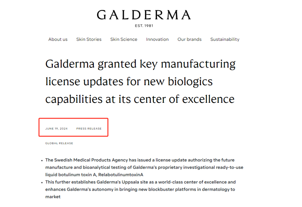 2024年6月19日,高德美位于瑞典乌普萨拉的卓越生产中心正式获得瑞典药品监督管理局发布的生产许可证,许可其对其研发的即用型液态A型肉毒毒素开展生产和生物分析检测。据悉,RelabotulinumtoxinA是一种创新的、高活性的、不含复合物的、即用型液态A型肉毒毒素,使用专有菌株,并采用独特的先进工艺制造。