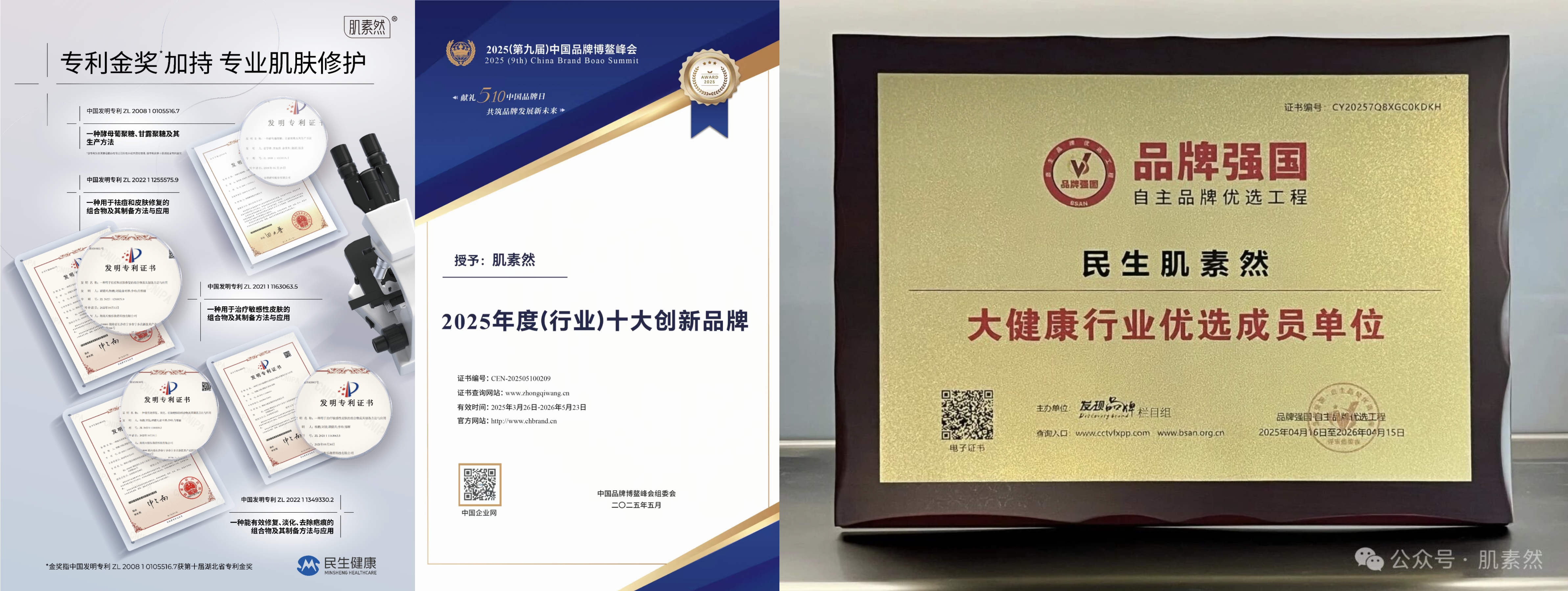 顶尖医研背景:「民生“肌素然”」专注多肽领域的前沿创新,联合中南大学湘雅医学院、华中科技大学同济医学院、湖南师范大学等知名高校及高端科研机构医研共创。品牌不仅拥有多项国家发明专利(如专利号:ZL 2022 1 1255575.9),更与全球领先的酵母供应商安琪酵母强强联手,构建了从源头创新到成果转化的全链路研发壁垒。在此基础上,品牌凭借其卓越的创新能力,接连荣获“品牌强国·大健康行业优选成员单位”及“2025年度(行业)十大创新品牌”等重磅荣誉,展现了从技术布局到产业引领的综合实力!