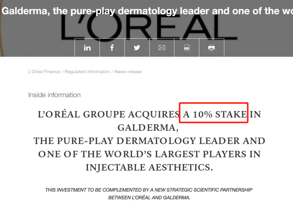 2024年8月5日,欧莱雅集团发布公告称,拟收购全球专业皮肤健康公司高德美Galderma公司10%的股份。据悉,欧莱雅表示此次收购是欧莱雅和高德美之间更广泛的战略科学合作伙伴关系的一部分。