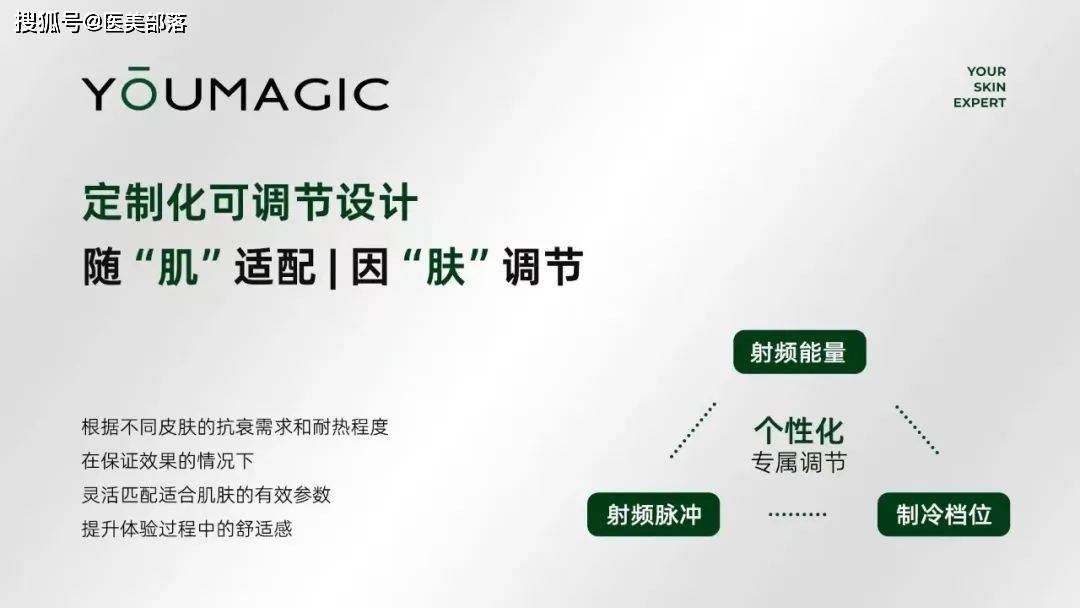 YOUMAGIC单极射频在核心单极射频技术的基础上,采用AI能量控制技术、闪脉冲调节技术、四档冷喷技术等多项前瞻技术,并应用了多维温控传感装置,可实现舒适有效、不敷麻的抗衰体验。通过多重制冷调节技术和多维智能温控系统相结合,不仅实现了在射频过程中对皮表进行冷喷降温操作,还能实时测量操作区域温度,在不敷麻药同时,也实现了外温内热的超强舒适感、有效性和安全感。